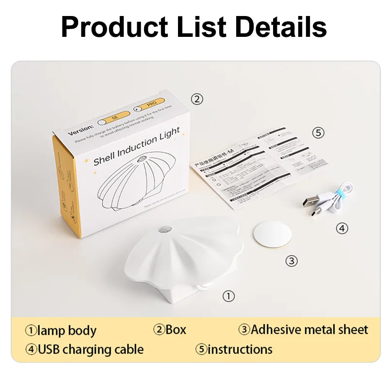 A compact, shell-shaped motion sensor night light with adjustable lighting levels and USB rechargeable battery. Features multiple modes including all-day, night-sensing, and constant-on for optimal use in bedrooms, corridors, stairways, or wall displays.